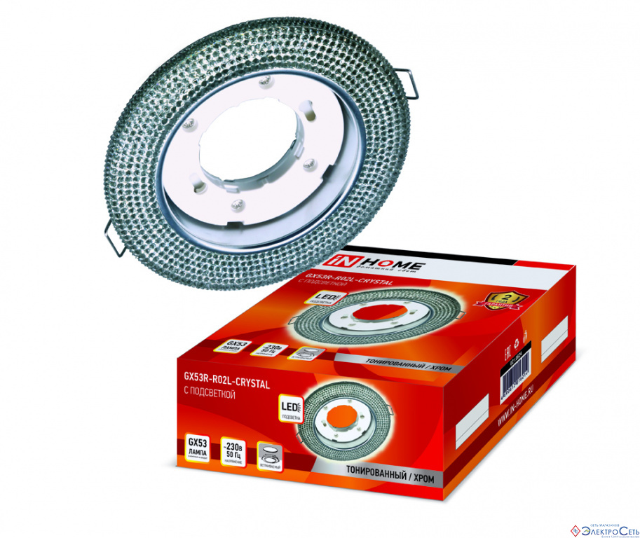 Встраиваемый светильник IN HOME серии GX53R-crystal под лампу GX53 предназначен для работы в сетях переменного тока 230 В. Модель проста в монтаже, идеально подходит для установки в подвесные и натяжные потолки. Может использоваться для освещения жилых и общественных помещений, офисных зданий, торговых комплексов, кафе, ресторанов и т.д. Подходит для основных и вспомогательных мест общего пользования (коридоры, лестничные пролеты, столовые, конференц-залы, спортзалы и др.). Может работать со светодиодными лампами GX53 мощностью от 2 Вт до 13 Вт с цветовой температурой от 2700 К до 6400 К.